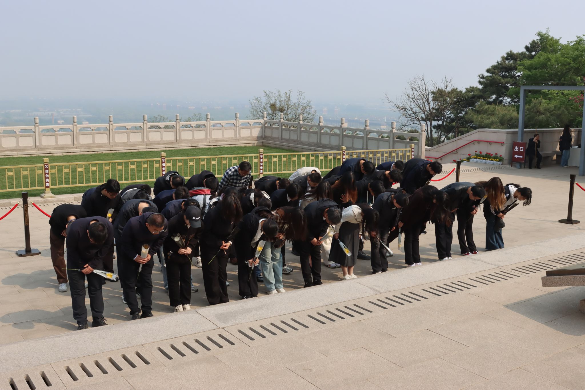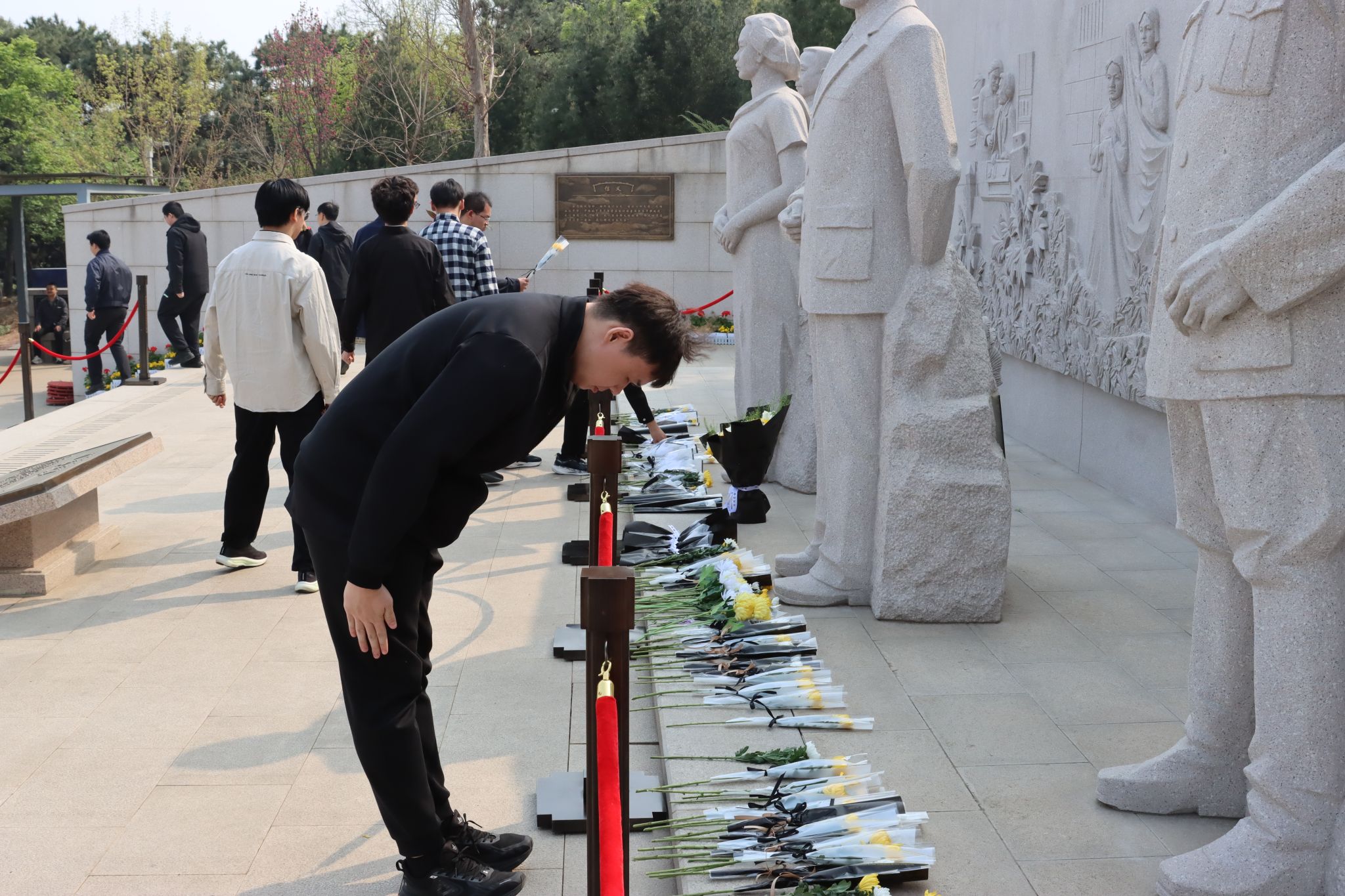 宣讲结束后,致敬仪式正式开始。全体师生身着素净服装,在吴石、朱枫、陈宝仓、聂曦四位烈士塑像前整齐列队,神情庄重、垂首肃立,向为国家与人民献出生命的隐蔽战线英烈默哀致敬,并行三鞠躬礼,以最崇高的礼仪告慰不朽忠魂。默哀毕,师生们手捧黄白菊花,依次缓步上前,将鲜花轻轻敬献于塑像前,俯身鞠躬、驻足凝望,与跨越七十余载的忠魂展开一场无声对话。石壁上的英名历历在目,塑像中的目光坚毅如炬,无声诉说着无名英雄们“干惊天动地事,做隐姓埋名人”的无私与无畏,让每一位参与者接受了一次深刻的红色精神洗礼。