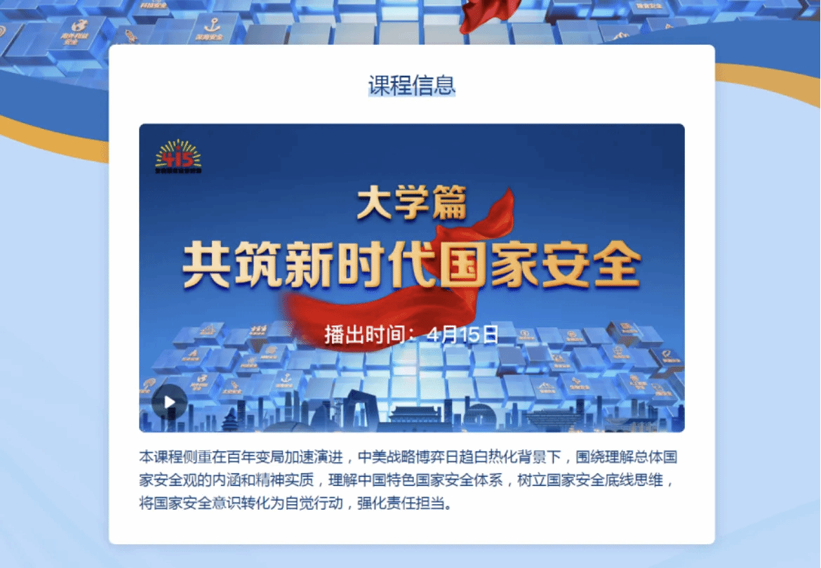 2026年4月15日是第11个全民国家安全教育日,主题为“统筹发展和安全 护航‘十五五’新征程”。当日,由教育部等三部门联合主办的全国大中小学生总体国家安全观“思政大课”上线人民日报客户端,传递“国家安全,人人有责”的时代强音。